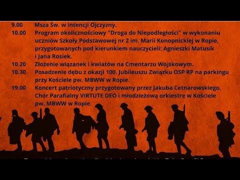 Zapraszamy Państwa do obejrzenia Wieczornicy Patriotycznej przygotowanej pod kierunkiem Pana Jakuba Cetnarowskiego wraz z młodzieżą z Parafii Ropa, z okazji obchodów Święta Niepodległości. W wydarzeniu wziął udział również Chór Parafialny działający przy Parafii Rzymskokatolickiej pw. Św. Michała Archanioła w Ropie. Szczególne podziękowania należą się Marszałkowi Województwa Małopolskiego oraz Wójtowi Gminy Ropa za udzielenie wsparcia finansowego. Podziękowania dla Pana Jakuba Cetnarowskiego za aranżację i przygotowanie programu, Księdzu Marcinowi Bukowiec, Młodzieży i Chórowi Parafialnemu za przepiękny koncert. Organizatorzy Wieczornicy Patriotycznej: Parafia Rzymskokatolicka pw. Św. Michała w Ropie oraz Stowarzyszenie Pogranicza.