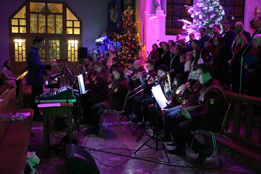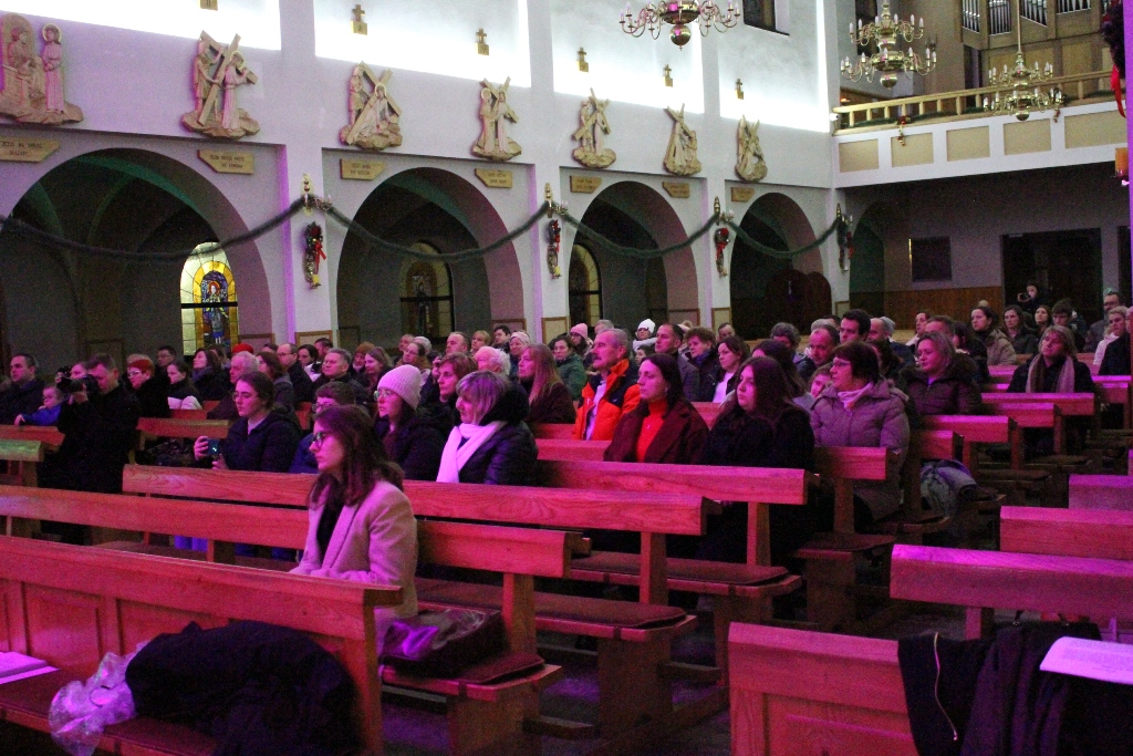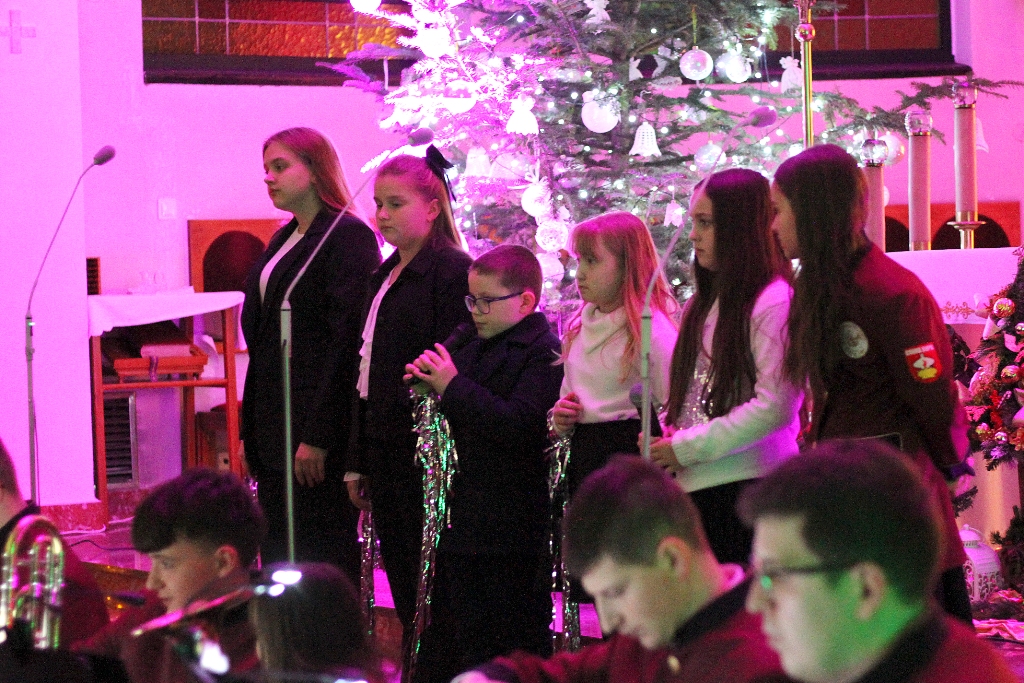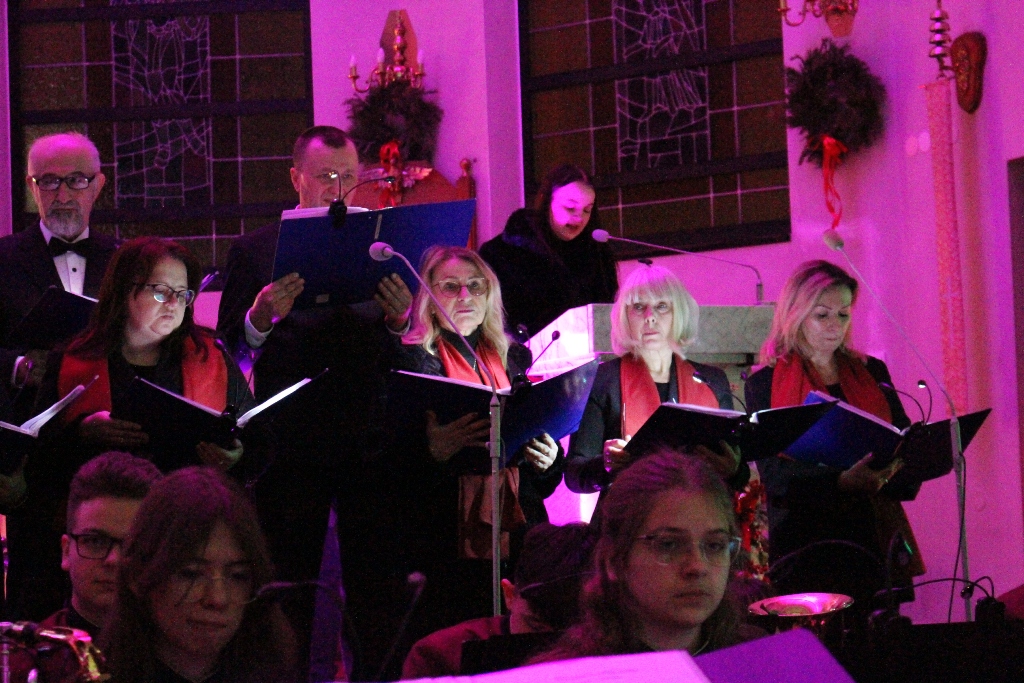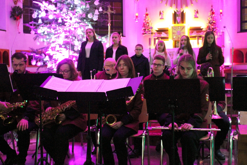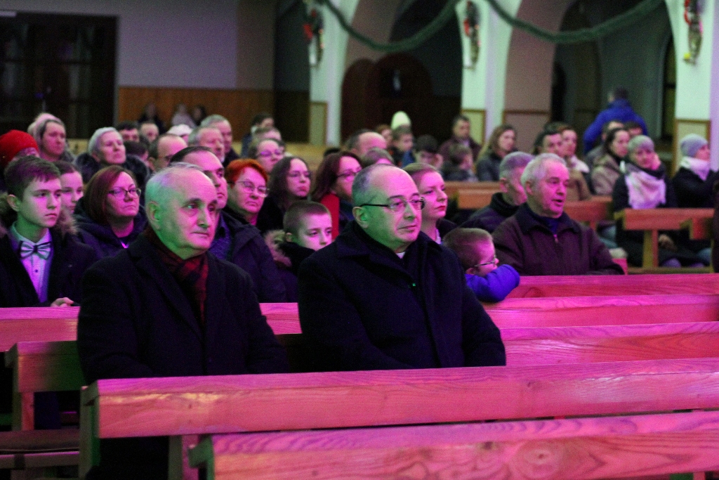 Był to wyjątkowy wieczór, pełen wzruszeń i świątecznej radości. Usłyszeliśmy najpiękniejsze kolędy i pastorałki w wykonaniu dzieci i młodzieży ze Studia Wokalnego GOK, działającego pod kierunkiem Katarzyny Burkot, Chóru Parafialnego Virtute Deo, a także solistów: Zuzanny Matuszyk, Mirosława Skrzypca, Julii Kulki oraz Krzysztofa Libera. Szczególnym akcentem był pierwszy występ podczas Koncertu Kolęd Orkiestry Dętej działającej przy GOK, pod batutą Jakuba Cetnarowskiego, który pełnił rolę maestro całego wydarzenia.